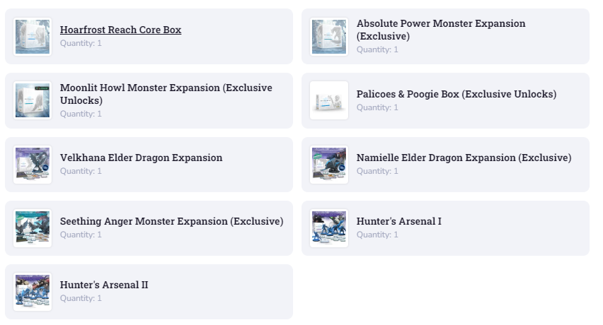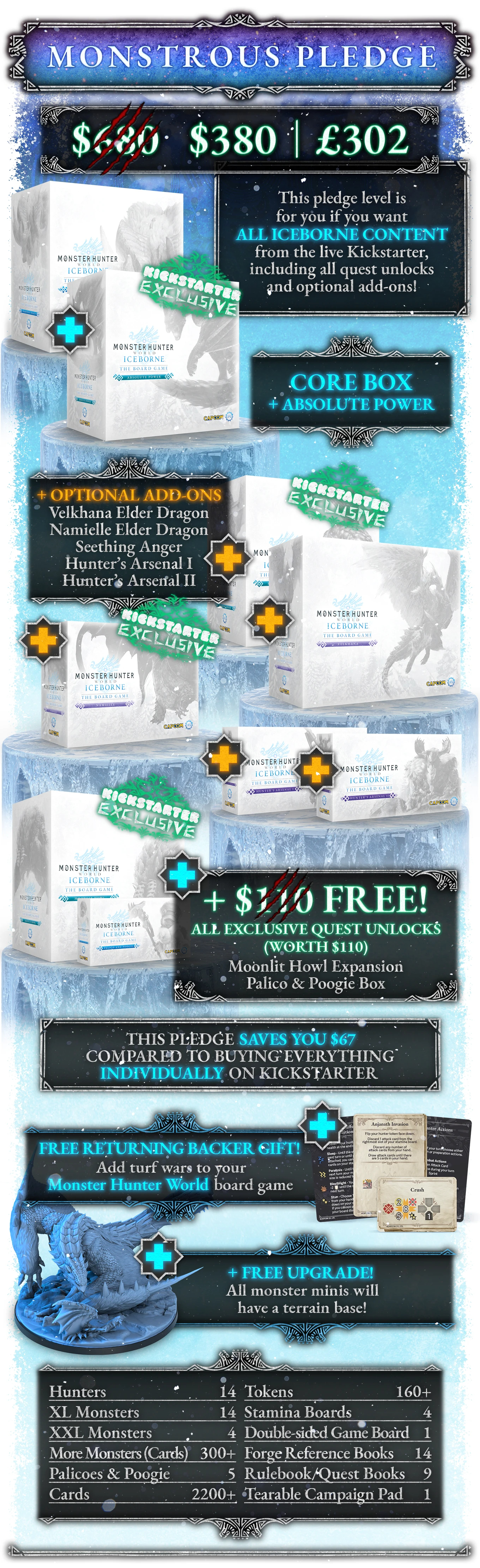❄️ 7 gameplay expansions (including 4 Kickstarter exclusive expansions)❄️ 18 unique monster minis (XL and XXL!)❄️ Gameplay for 6 monster subspecies / variants❄️ All 14 hunters!❄️ 1 cute cosmetic expansion (Poogie and Palicoes)✅ This pledge level includes all the Kickstarter exclusive unlocks✅ This pledge level includes all Iceborne content from the live KickstarterIncludes:- MHW Iceborne: Hoarfrost Reach Core Box- Absolute Power Monster Expansion (Exclusive!)- Moonlit Howl Monster Expansion (Exclusive Unlocks)- Palicoes & Poogie Box (Exclusive Unlocks)- Seething Anger Monster Expansion (Exclusive)- Velkhana Elder Dragon Expansion- Namielle Elder Dragon Expansion (Exclusive)- Hunter's Arsenal I- Hunter's Arsenal II- Wave 2 & Deluxe Bundle- MHW Turf Wars Upgrade Deck