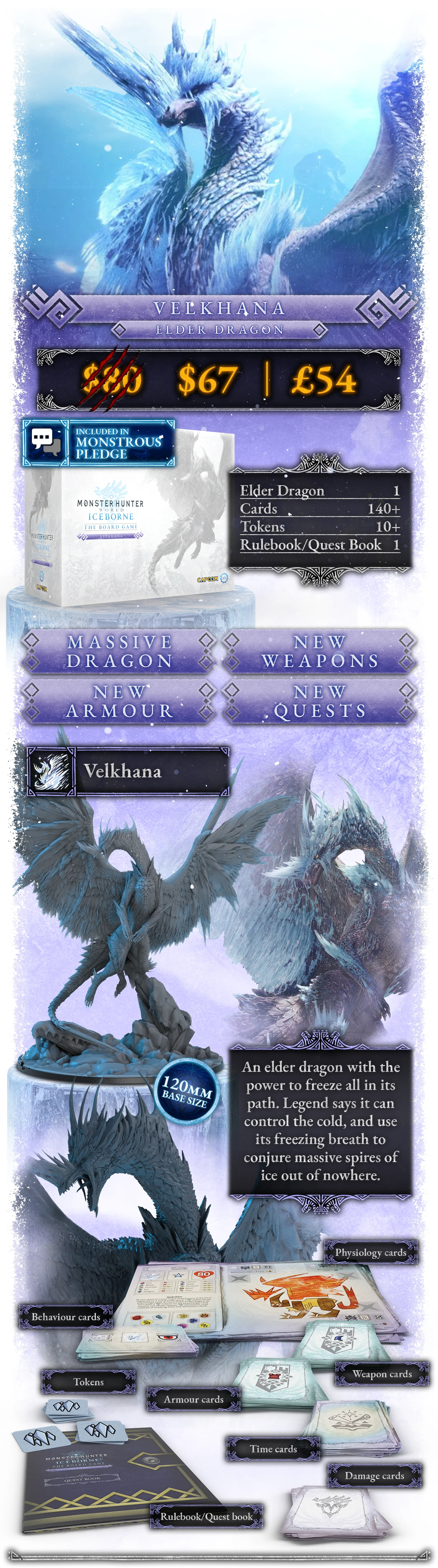 The Velkhana expansion adds this magnificent elder dragon and all its adrenaline-pumping quests, rare weapons, and powerful equipment crafting options to your pledge. That means: