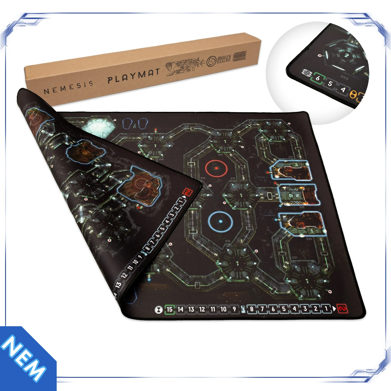 Double-sided playmat for the original Nemesis, with the ship's interior board. The playmat is 840x560mm and has stitched sides.