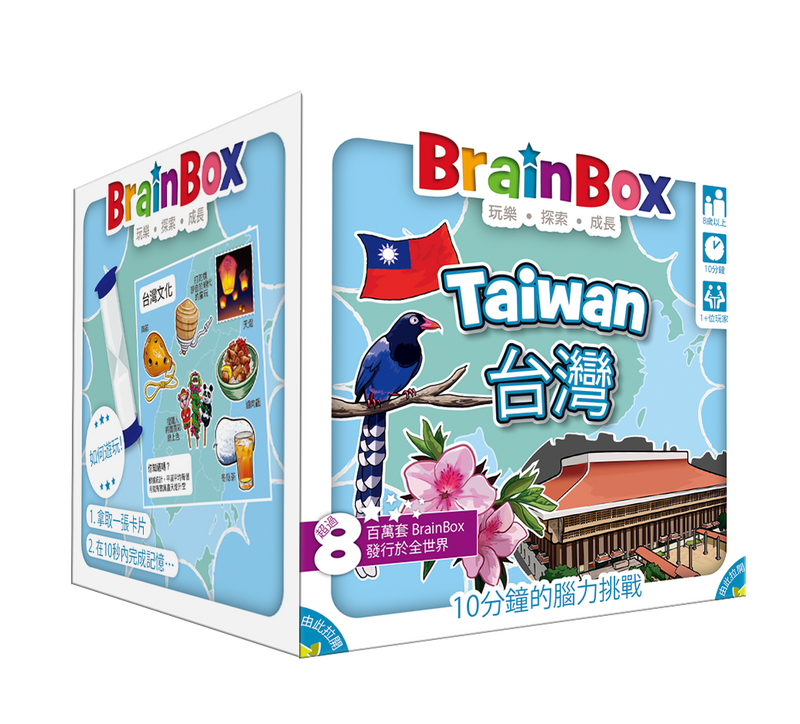 《BrainBox 大腦益智盒》將激發年輕人與老年人的思想,並進行一場令人興奮與歡快的探索之旅,增進觀察力與記憶力。《大腦益智盒:台灣》是以台灣在地文化為主題,總計55張遊戲卡片,並包含440個互相獨立的問題。從各個縣市的在地名勝、名產,到台灣各大國家公園與原住民族。這盒包含了所有台灣的特色,宛如在桌上展開一場環島之旅。透過《大腦益智盒:台灣》你們將一同遊玩、學習。
